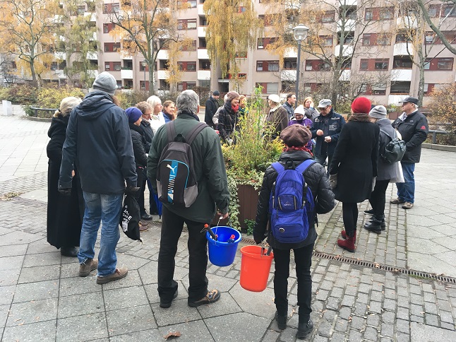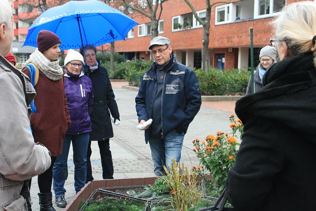 Ein Rundgang im November führte die BrunnengärtnerInnen zu unterschiedlich begrünten Orten und zu potenziellen Flächen für einen Gemeinschaftsgarten. Währenddessen wurden Blumenzwiebel vergraben, die im Frühjahr das Brunnenviertel-Brunnenstraße aufblühen lassen werden.